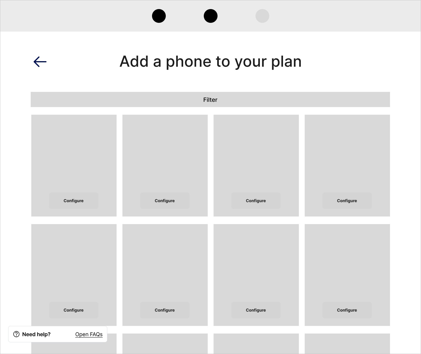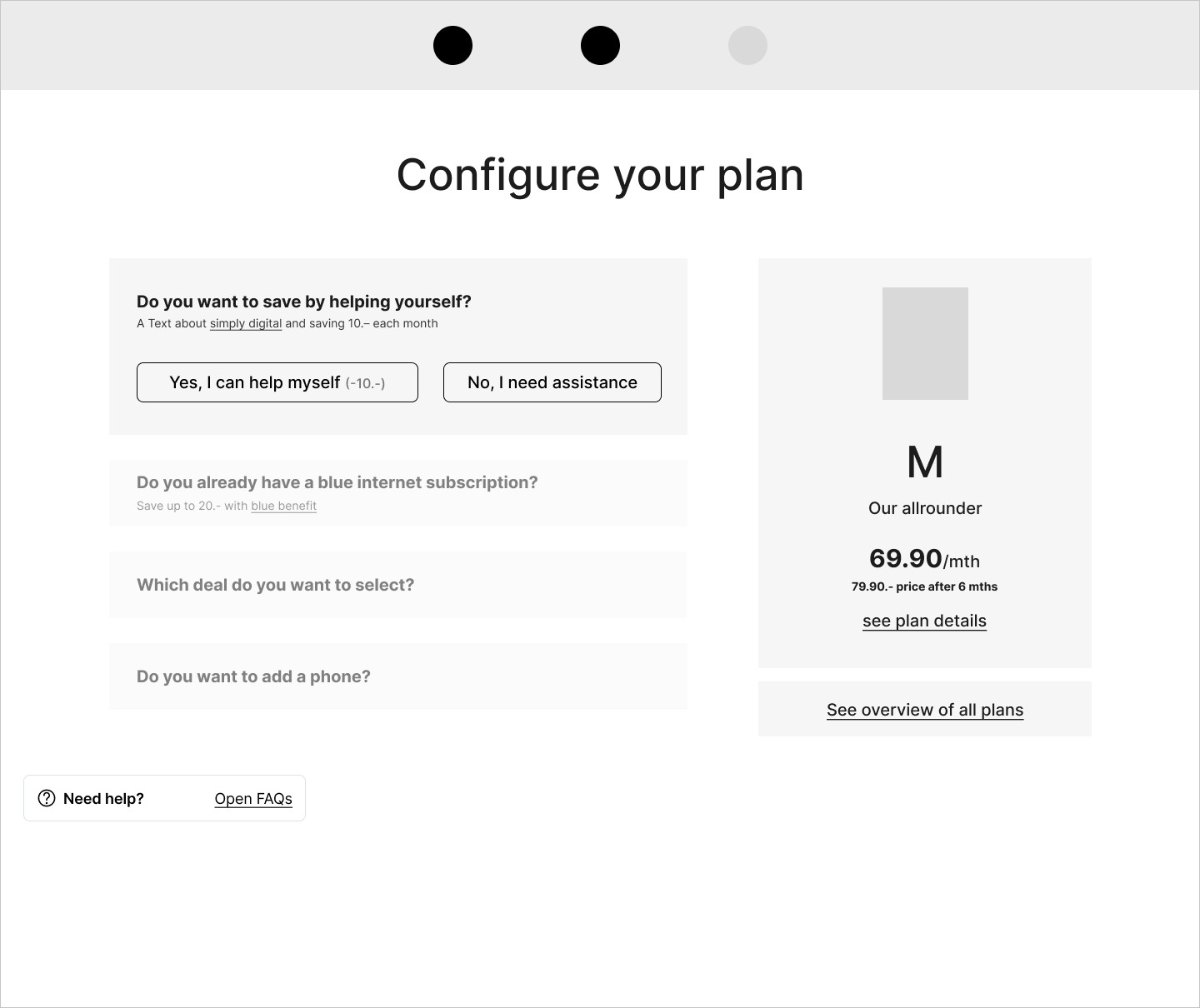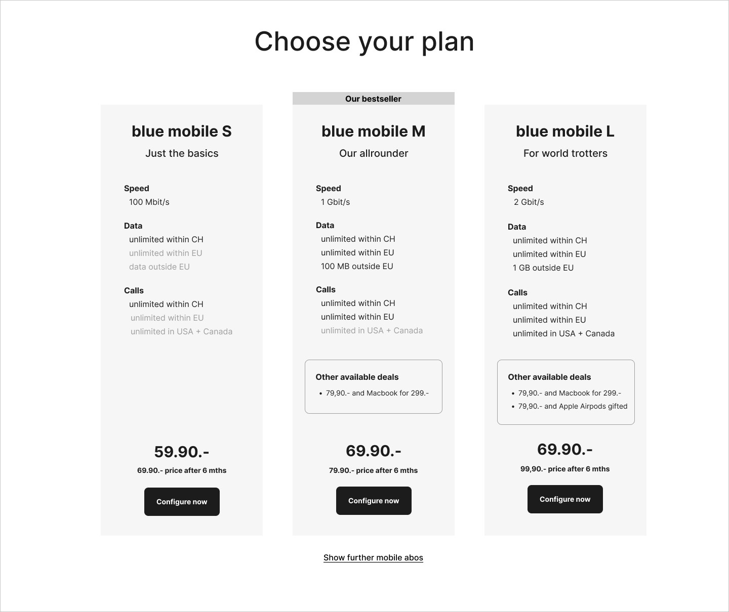 Zudem fand die gesamte Produktkonfiguration auf einer einzigen Seite statt, was zu einer hohen Informationsdichte und komplexen Entscheidungsprozessen führte. Die Seiten boten nur begrenzte Unterstützung bei der Auswahl passender Angebote.