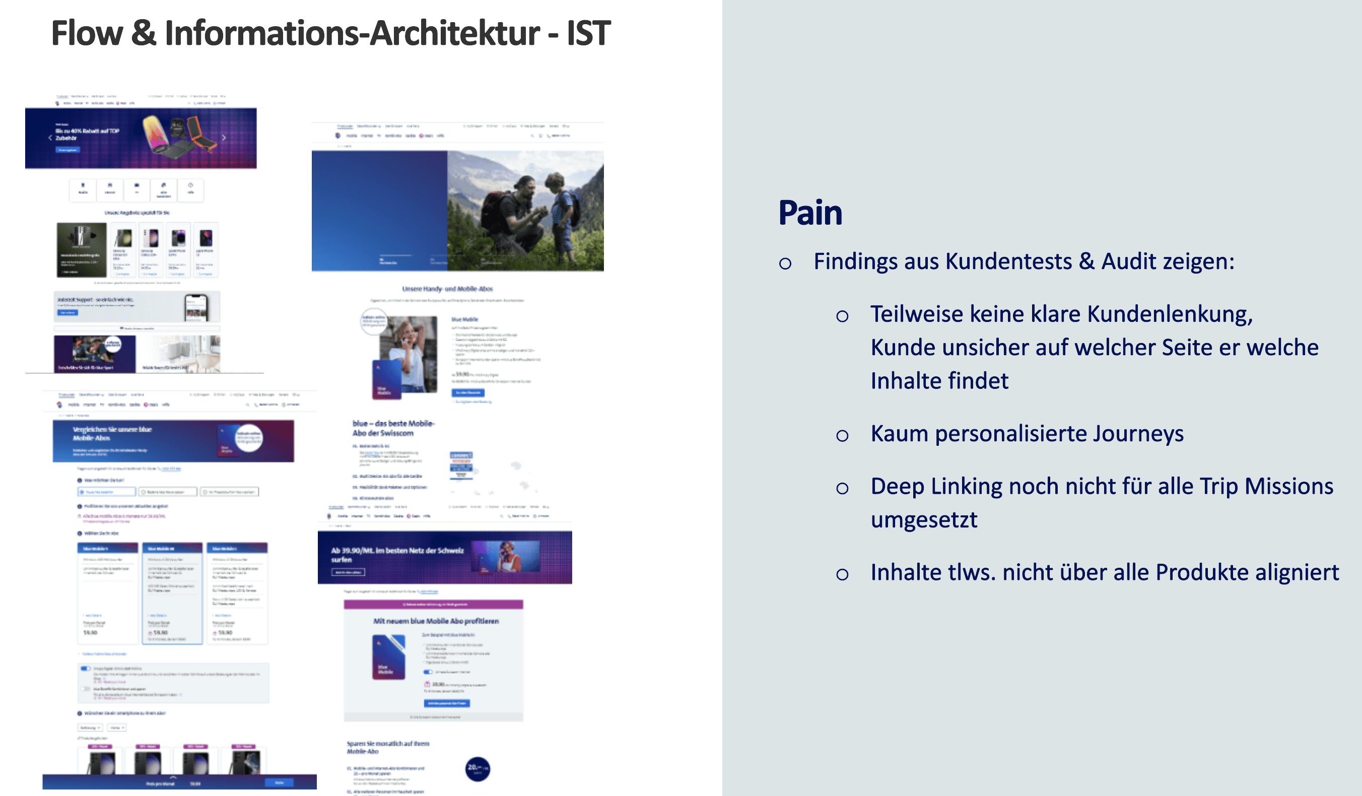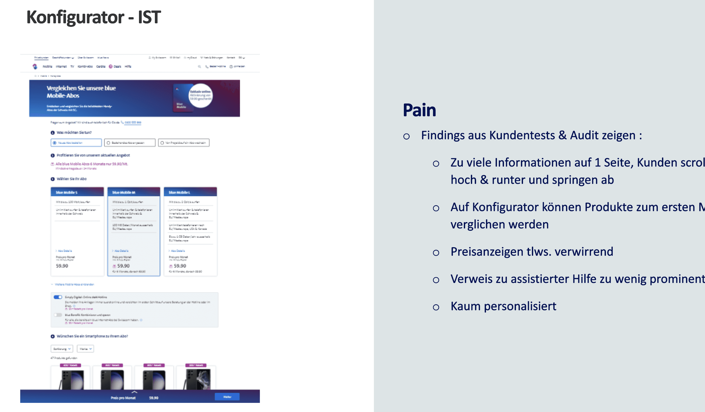 Informationsarchitektur und Navigation waren teilweise unklar, wodurch Nutzer unsicher waren, wo sie relevante Inhalte finden. Gleichzeitig waren Produktkonfigurationen und Entscheidungsprozesse komplex und boten nur begrenzte Unterstützung bei der Auswahl passender Angebote. Auch Personalisierung und klare Einstiegspunkte in zentrale Journeys waren nur eingeschränkt vorhanden.